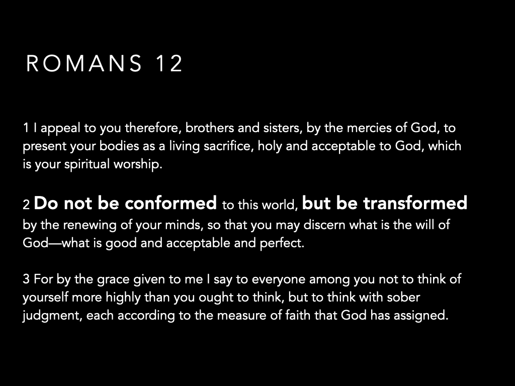 I talked about the film, The Greatest Showman.4 It’s a lovely film about these folks who had been rejected because they didn’t fit societal norms and they come together, knowing that they matter in the world, and they begin to show up in the world and don’t believe that they are a threat to one another, and so I asked them, “Will you be a people who refuse to conform, and instead, are transformed by this love of God? Will you be a people who are changed and transformed, who act as if there is enough for all of us because we’re rooted in this love of God.