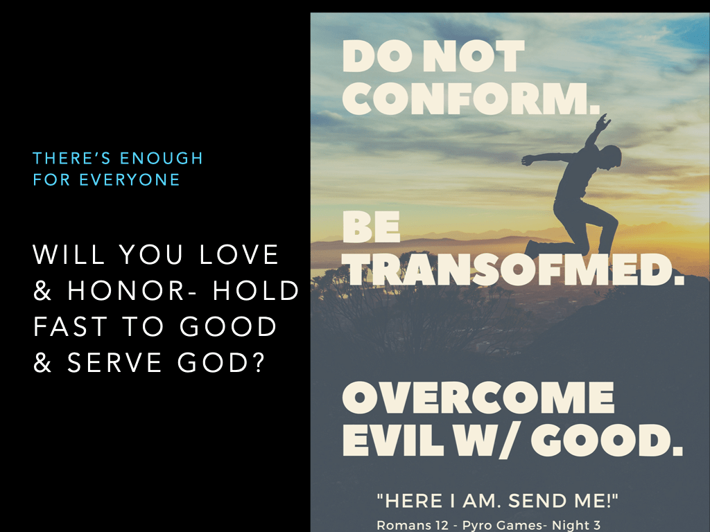 It’s fun to watch a bunch of grown-ups doing The Hunger Games salute, so way to go you! We’re now on to night three. On night three I talked about how 1) if we’re a people who know that our names are called by God, 2) who are refusing to play the game by the rules because we know who God is inviting us to be, then 3) this allows us to be people of love, to be people who are actually in relationship with God and with one another in a different sort of way.