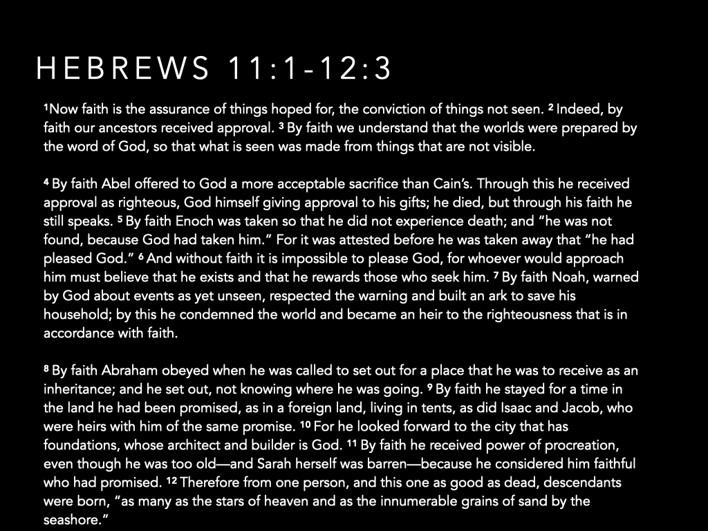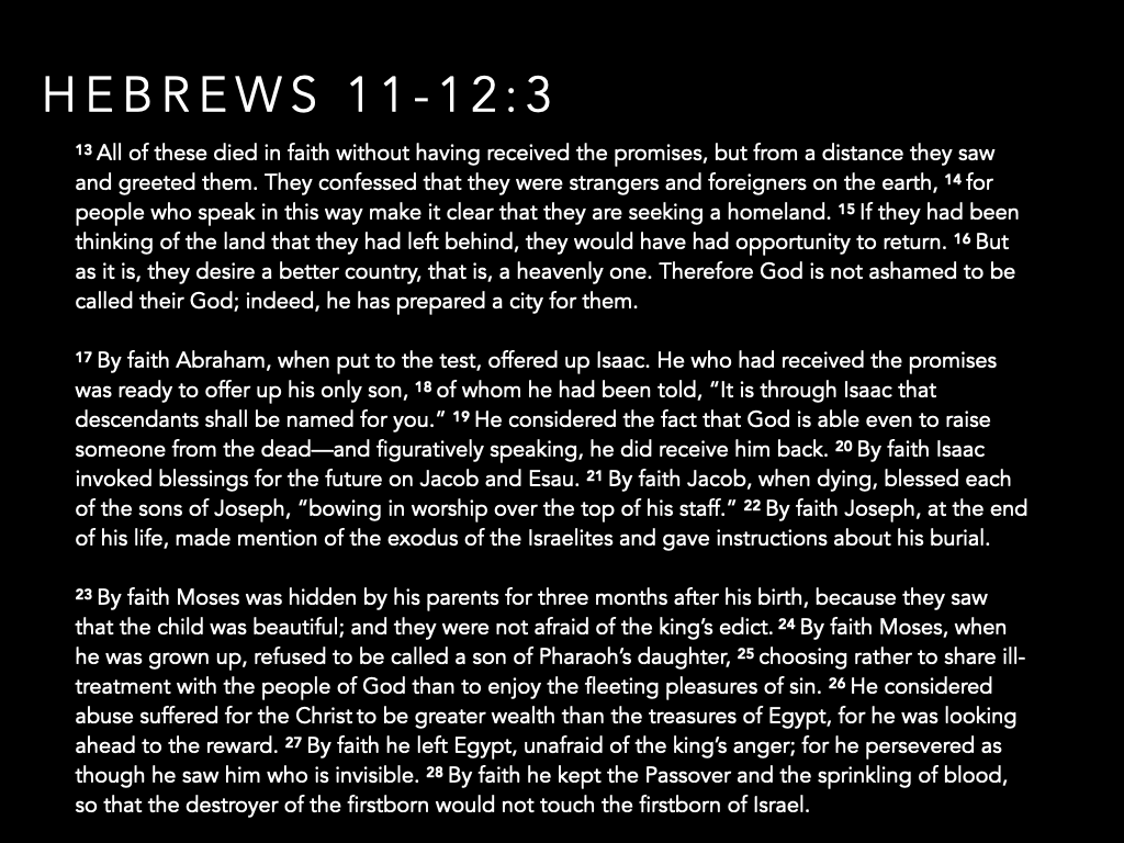 Moving on to chapter 12, “So therefore, since we’re surrounded by this great cloud of witnesses,” which includes all of these people, Moses, Abraham, Sarah, all of those, but it’s all of us. We aren’t alone in this. We don’t go home alone, we don’t move alone. We do this together. That allows us to throw off the things that hinder, and entangle, and ensnare us as a people, and so I asked them a question that I want to ask us this morning,