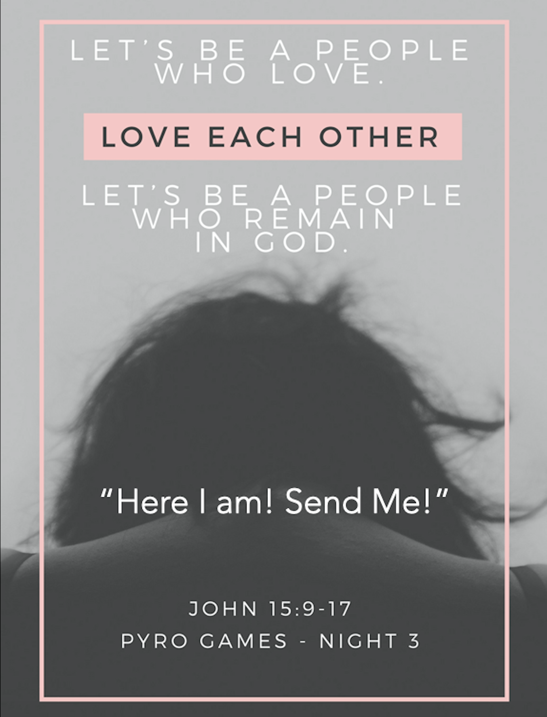 There’s a lot more to unpack obviously, but I wanted you to get a little bit of a taste of what the students, what we all did together this week, because I also think that as grown-ups, we’re not that different. We all need to be reminded that God calls our names, that we are loved by God, that we are called to say, “Here I am. Send me,” and we do this together in community, so may we be a people who are indeed the yes to Jesus’ prayer. May we know we are loved. May we be Christian.