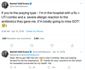 On April 14th, Rachel Held Evans posted her final tweets. She wrote: “If you’re the praying type–I’m in the hospital with the flu + UTI combo and severe allergic reaction to the antibiotics they gave me (I’m totally going to miss G(ame) O(f) T(hrones) (sad face)!).”2