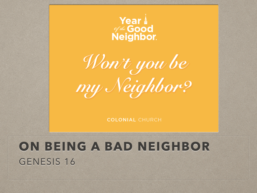 Well, good morning. Are you ready for Genesis 16? The sermon title this morning is “On Being a Bad Neighbor.” If you didn’t already gather this from hearing the reading, this text is rife with complexity, and I want us to talk about that complexity this morning.