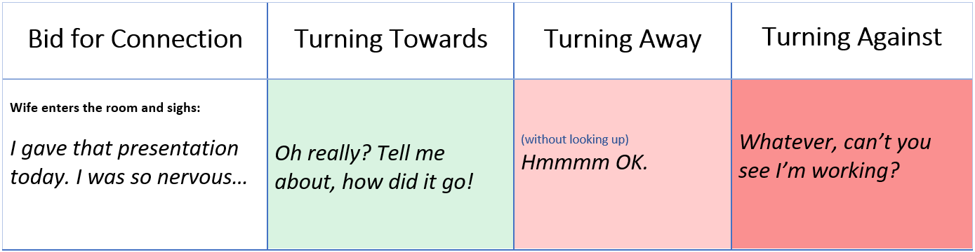 Now we have so many good reasons we turn away. Just yesterday, I had a migraine all day and found myself turning away from Andy, in a moment, in a bid for recognition that he had extended. And I knew exactly what was happening, but I was tired and my head hurt. Sometimes we turn away, whether it is, we literally just don’t turn when the person asks for that moment of recognition, whether it is we miss the question. In some way, we turn away from them, and the intimacy of whatever type of relationship that is, is melted away, and over time if we turn away, the divide becomes so great that it is difficult to bridge.