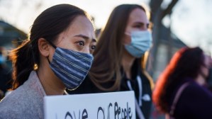 Another image that came to mind is this: of a couple on couch with a divide between them. Whether it be on a couch or on a bed, the space that looms large, even in our most intimate of relationships, where we don’t any longer know how to cross that divide. And then from this week, following the senseless violence in Atlanta, I was reminded of this image of our very own Madison Chau at a rally to cry out against racism and violence against Asian American and Pacific Islander persons. A cry: “See me. See my people.”