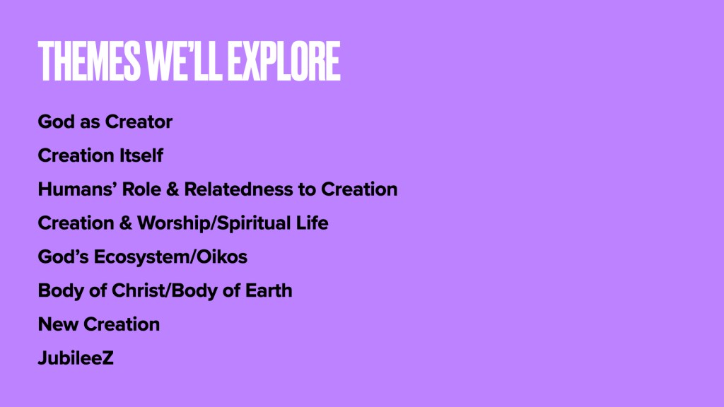 Join us for a class exploring theology and Creation. This five-week study will explore biblical, theological, and ethical resources for loving God and creation.