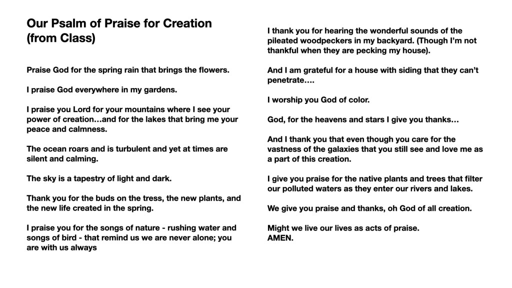 I praise you for the songs of nature – rushing water and songs of bird – that remind us we are never alone; you are with us always I thank you for hearing the wonderful sounds of the pileated woodpeckers in my backyard. (Though I’m not thankful when they are pecking my house).
